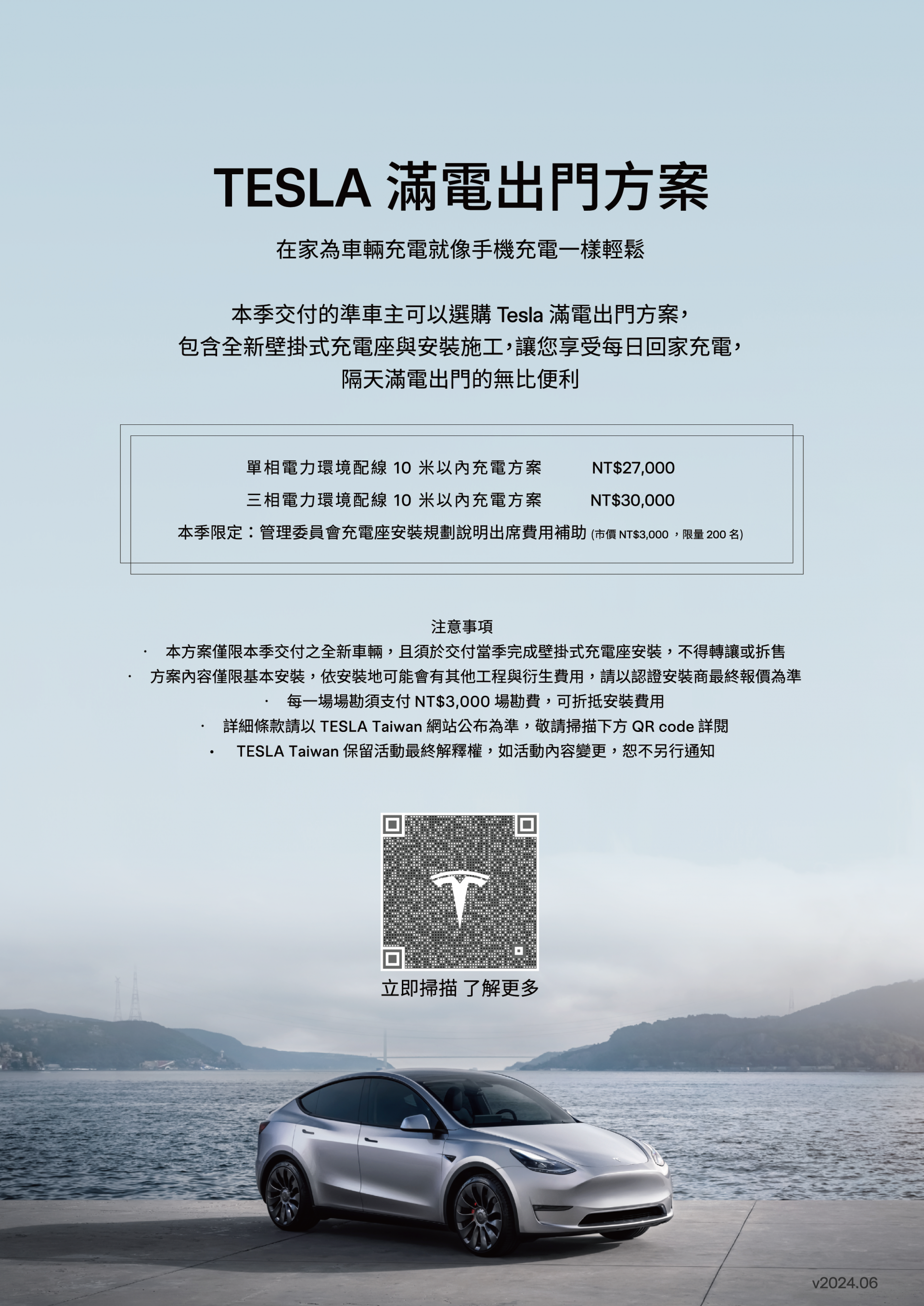 本季交付的準車主可以選購 Tesla 滿電出門方案: 包含全新壁掛式充電座與安裝施工,讓您享受每日回家充電, 隔天滿電出門的無比便利 單相電力環境配線 10 米以內充電方案 NT$27,000 三相電力環境配線 10 米以內充電方案 NT$30,000 本季限定:管理委員會充電座安裝規劃說明出席費用補助